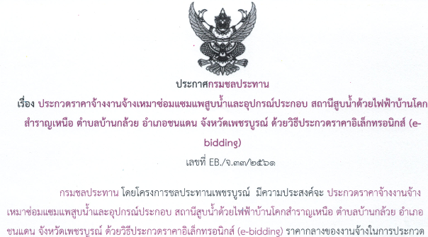 ประกาศกรมชลประทาน เรื่อง ประกวดราคาจ้างานจ้างเหมาซ่อมแซมแพสูบน้ำและอุปกรณ์ประกอบ สถานีสูบน้ำไฟฟ้าบ้านโคกสำราญเหนือ ตำบลบ้านกล้วย อำเภอชนแดน จังหวัดเพชรบูรณ์ ด้วยวิธีประกวดราคาอิเล็กทรอนิกส์ (e-bidding) เลขที่ EB/จ.33/2561