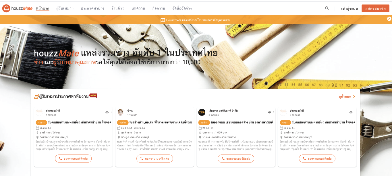 HouzzMate แหล่งรวมช่าง ที่เป็นสื่อกลางในการติดต่อที่สะดวกทั้งช่างและผู้อยู่อาศัย ผู้อยู่อาศัยสามารถเข้ามา ค้นหาช่าง หรือ ประกาศความต้องการ เพื่อ หาช่าง ไปทำงาน และ ช่างก็สามารถเข้ามา หางานช่าง เพื่อทำงานให้กับผู้ต้องการได้ง่ายๆ โดยเรายึดพื้นที่ในการให้บริการเป็นหลัก ดังนั้นทั้งช่างและผู้อยู่อาศัยจะได้ติดต่อกับผู้ที่คุณต้องการใกล้บ้าน หรืออยู่ในเขตที่คุณพร้อมไปบริการ ทำให้เกิดความน่าเชื่อถือ และมีความรวดเร็ว และระบบของเรายังช่วยให้คุณติดต่อประสานงานได้อย่างสะดวก