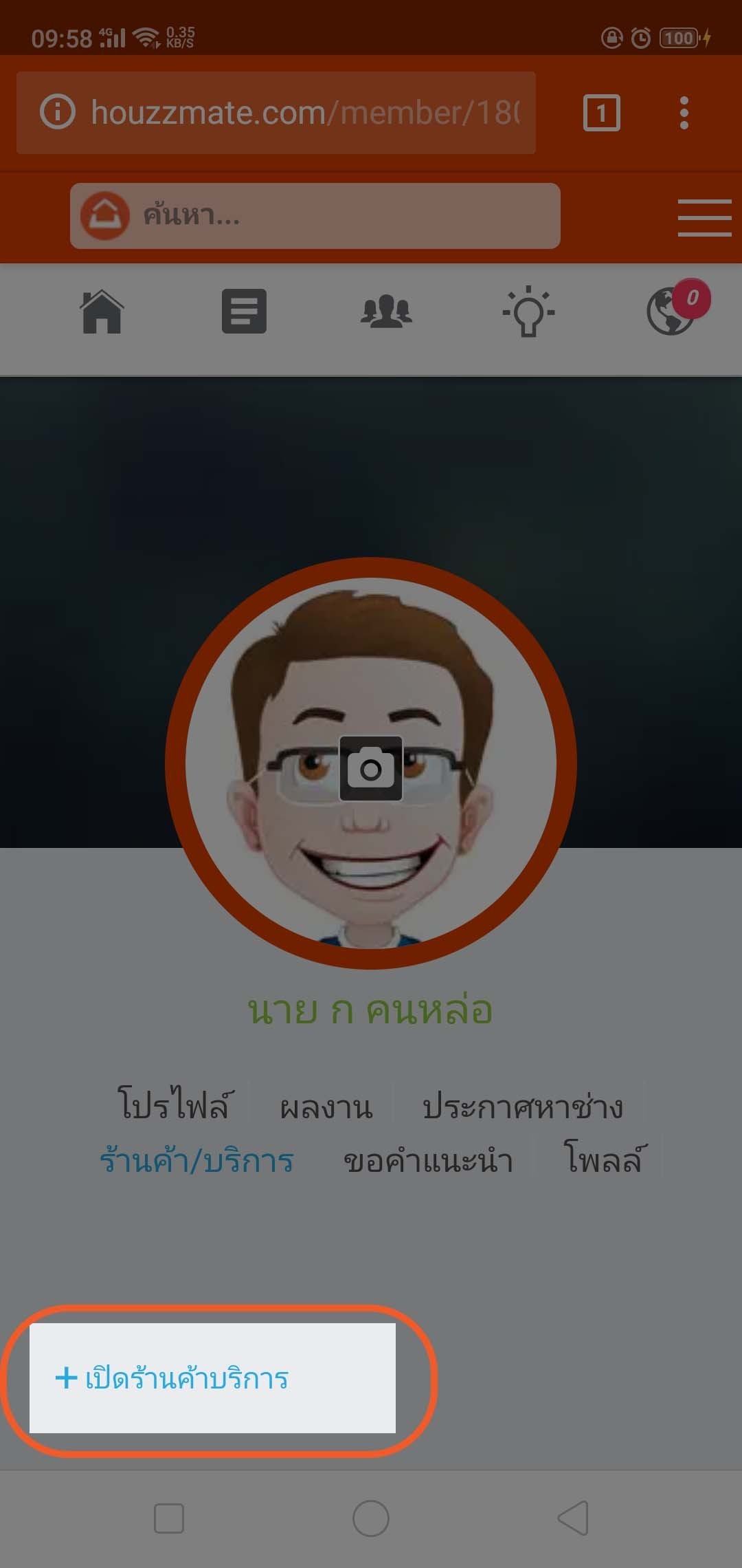 4.) ท่านจะเข้าสู่หมวดร้านค้า/บริการ ในหน้าโปรไฟล์ส่วนตัวของท่าน โดยให้เลื่อนหน้าจอลงมาข้างล่าง จากนั้นให้ท่าน แตะที่คำว่า +เปิดร้านค้าบริการ เพื่อเข้าสู่ขั้นตอนเปิดร้านค้าต่อไป