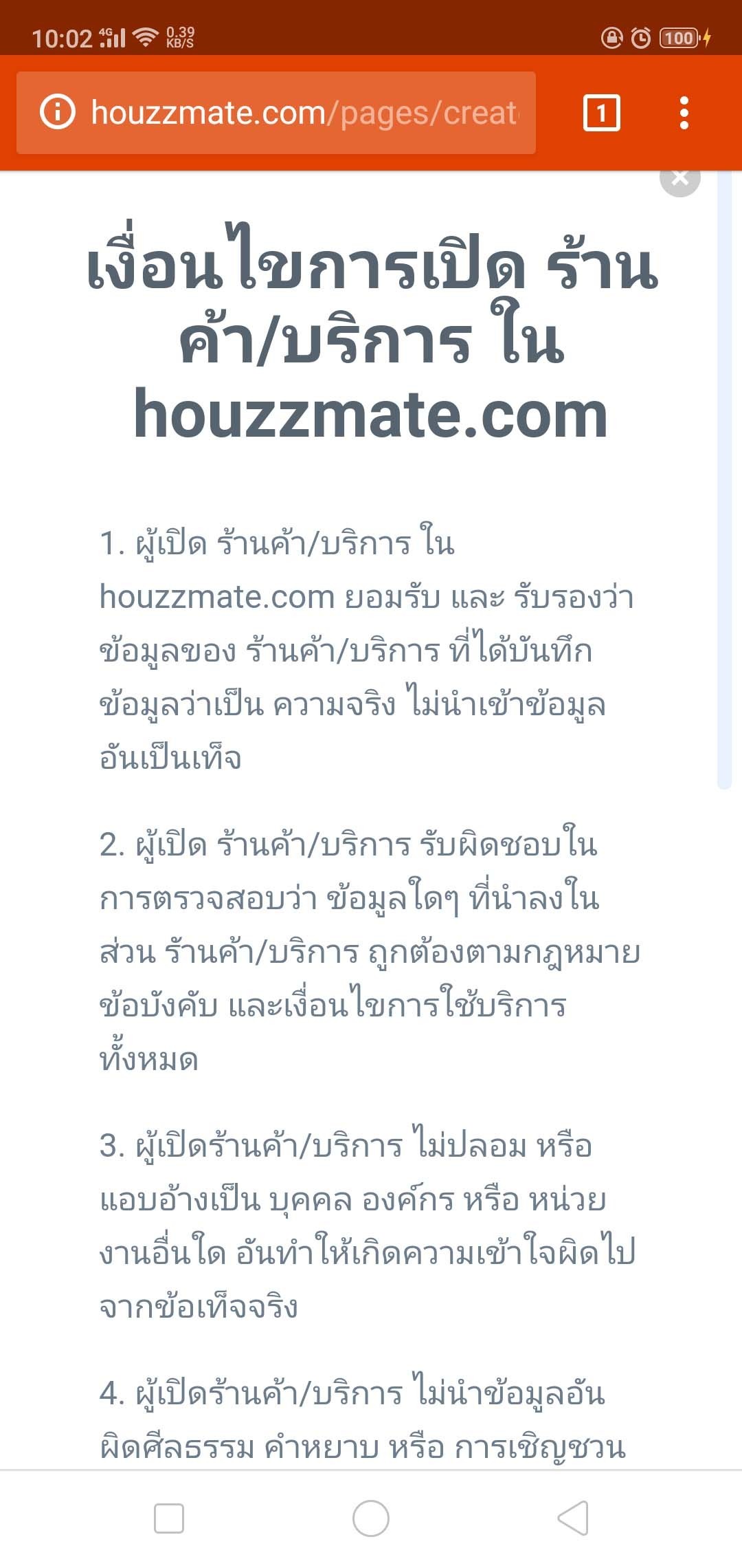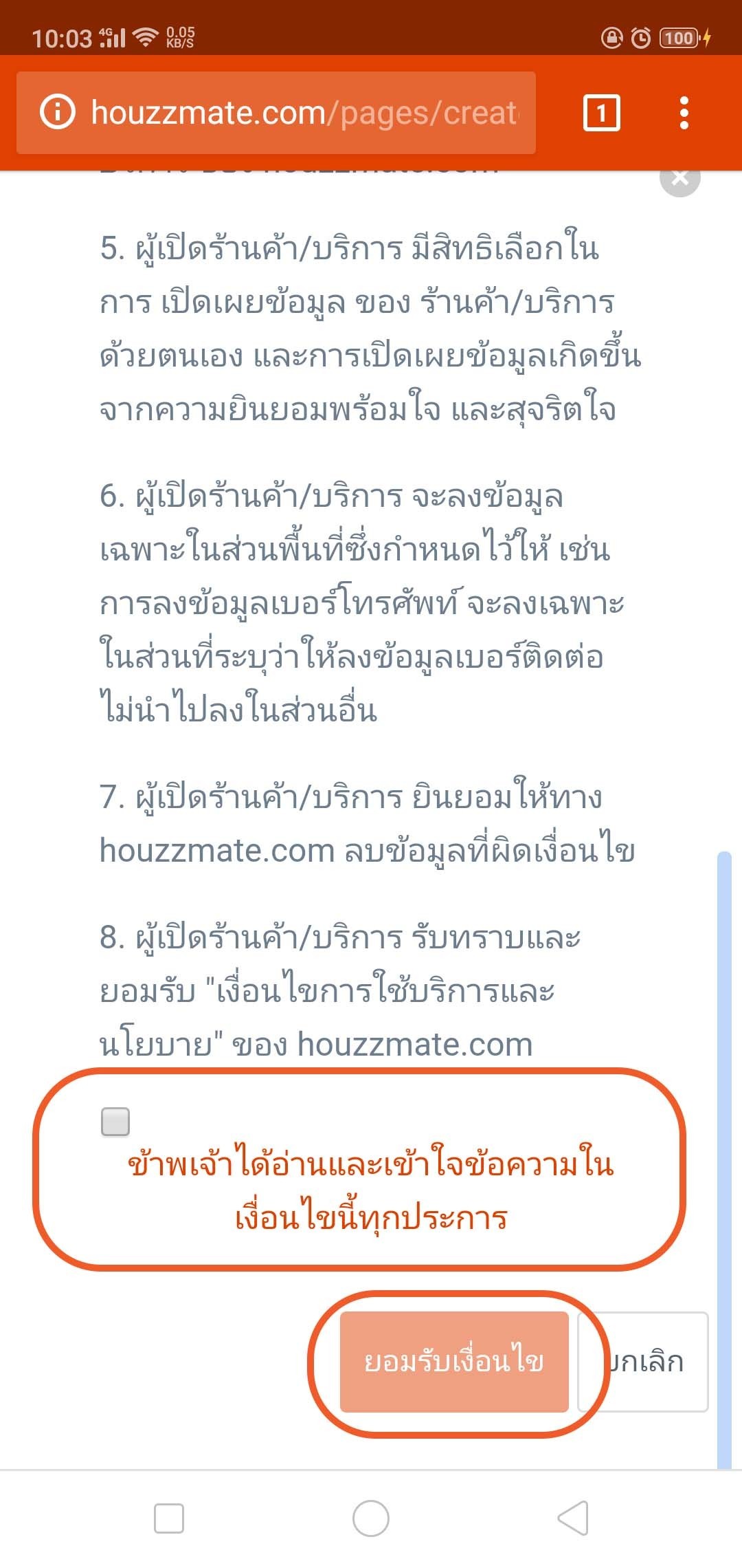 6.) จากนั้นจะเข้าสู่หน้า เงื่อนไขการเปิดร้านค้า/บริการ ของทางเว็บไซต์ เมื่อท่านรับทราบและยอมรับเงื่อนไขดังกล่าวแล้ว ให้เลื่อนหน้าจอลงมาข้างล่างสุด และ ติ๊กถูกที่ช่องหน้าประโยค ข้าพเจ้าได้อ่านและเข้าใจข้อความในเงื่อนไขนี้ทุกประการ และ แตะที่ปุ่ม ยอมรับเงื่อนไข ซึ่งปุ่มจะปรากฎชัดเจนขึ้นเมื่อท่านติ๊กถูกแล้ว