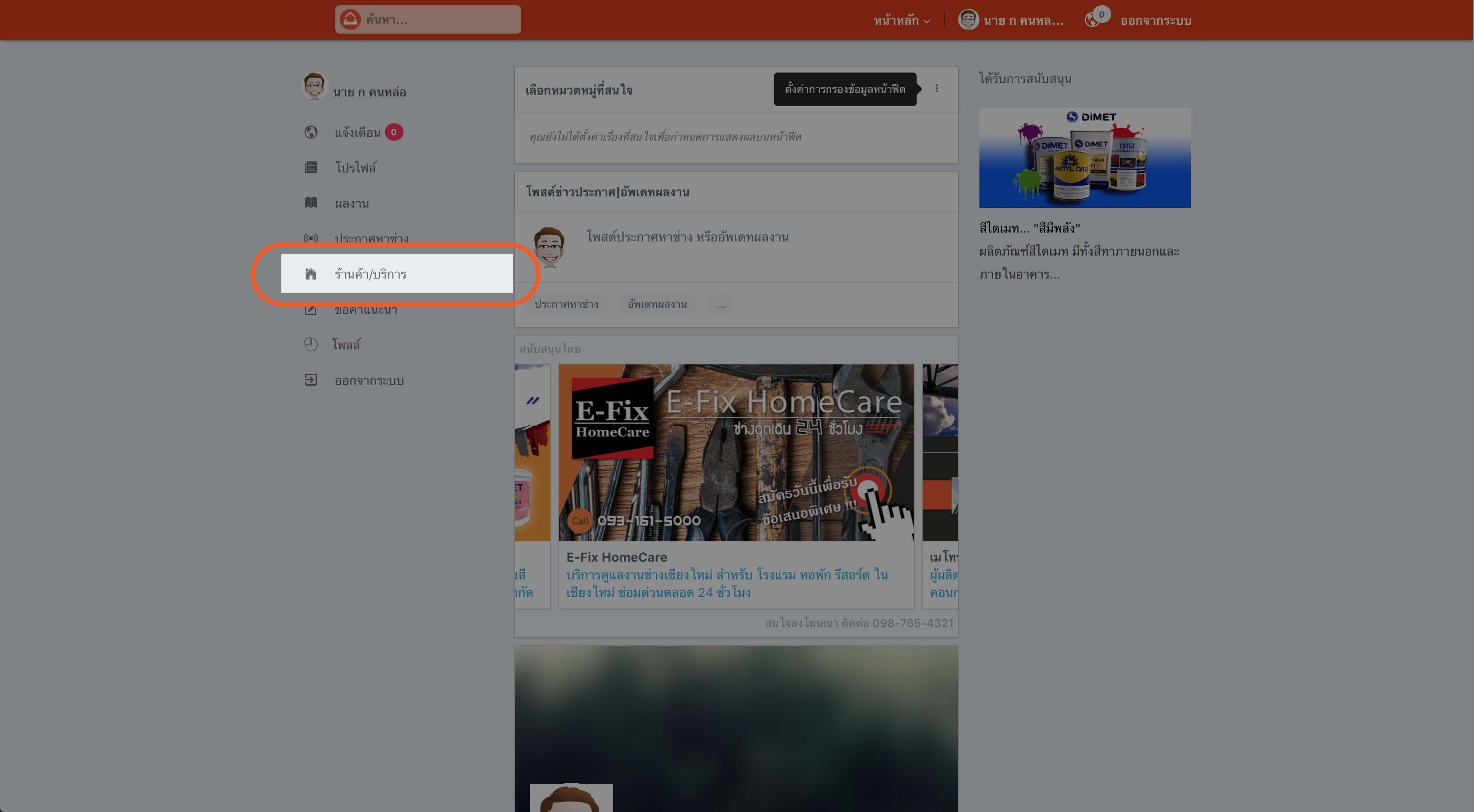 3.) ท่านจะเข้าสู่หมวดร้านค้า/บริการ ในหน้าโปรไฟล์ส่วนตัวของท่าน จากนั้นให้ท่านคลิกที่ชื่อร้านค้าของท่านที่ต้องการแก้ไข ดังรูปตัวอย่าง