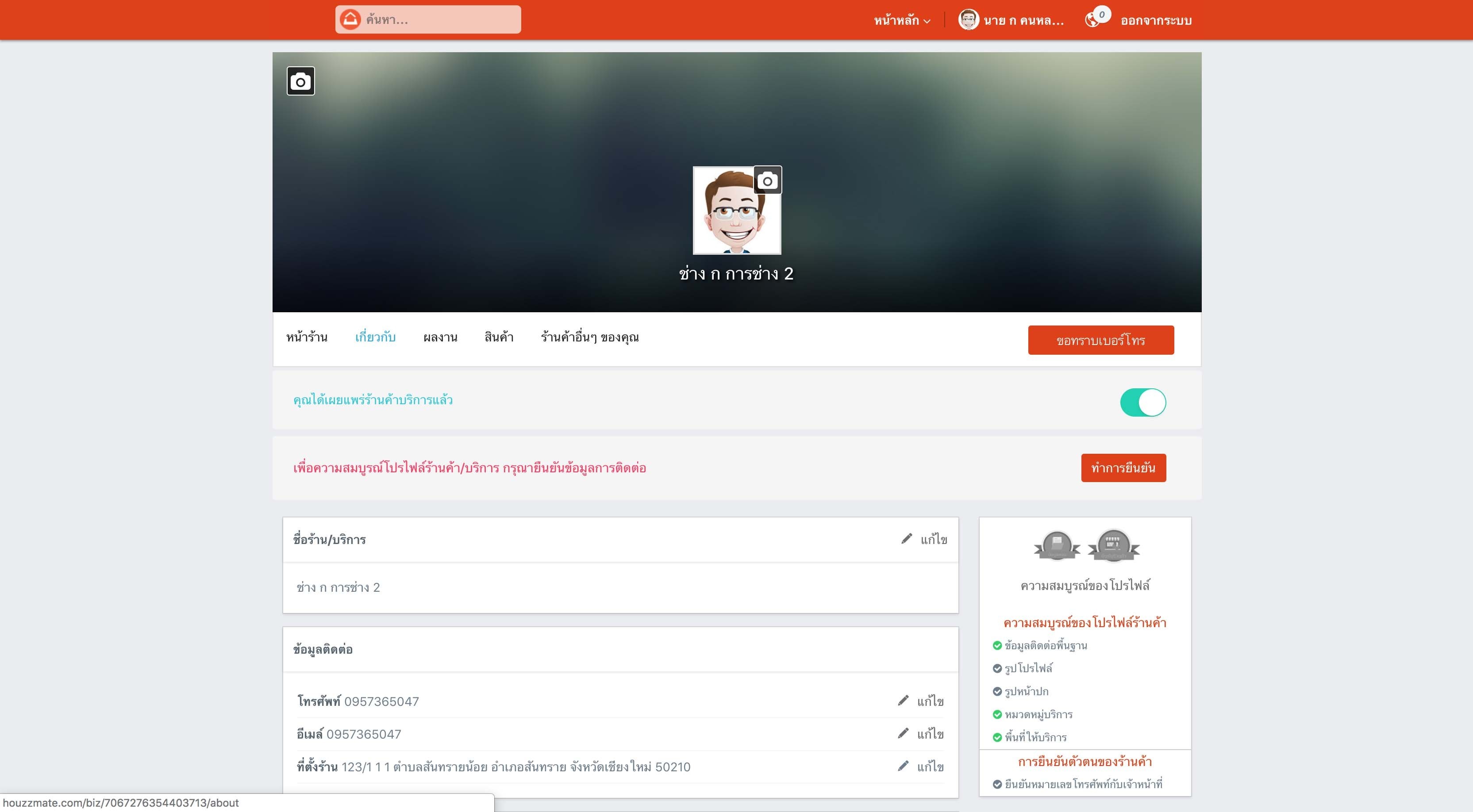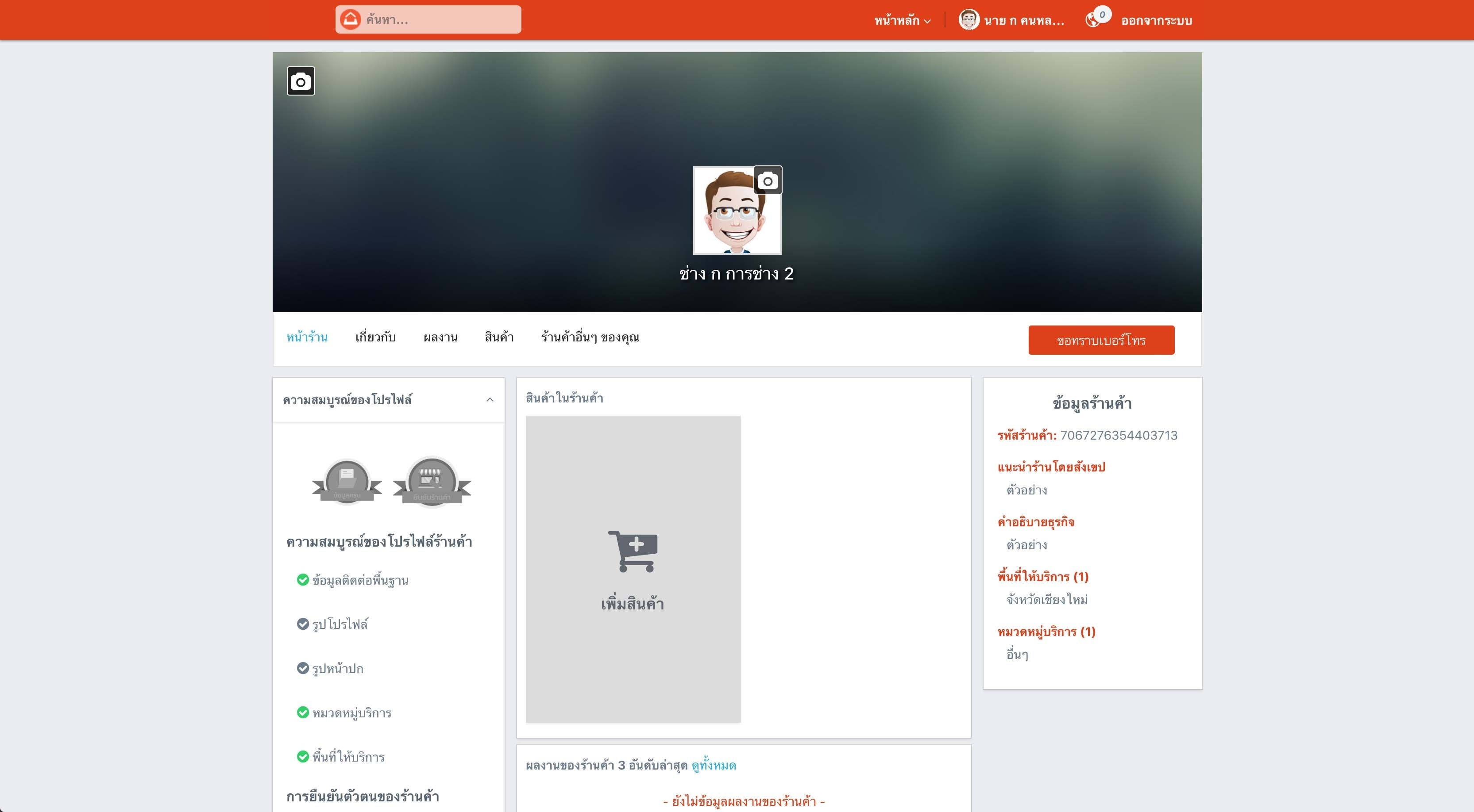6.) รูปแบบหน้าร้านค้าจะมีการเปลี่ยนไป ข้อมูลในส่วนต่างๆเกี่ยวกับร้านค้าที่ท่านได้ระบุในตอนเปิดร้านค้าจะปรากฎขึ้น ได้แก่ ชื่อร้านค้า/บริการ ข้อมูลการติดต่อ คำอธิบายแนะนำร้านโดยสังเขป คำอธิบายธุรกิจ พื้นที่ในการให้บริการ หมวดหมู่บริการ
