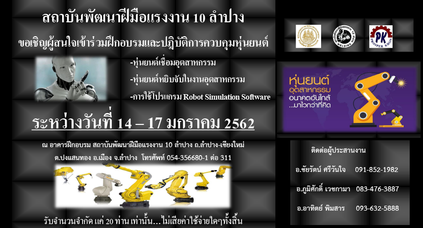 สถาบันพัฒนาฝีมือแรงงาน 10 ลำปาง ได้ประกาศขอเชิญชวนผู้ที่สนใจเข้าร่วมฝึกอบรมและปฎิบัติการควบคุมหุ่นยนต์ โดยจะมีหัวข้อต่างๆในการอบรม ได้แก่ หุ่นยนต์เชื่อมอุตสาหกรรม,หุ่นยนต์หยิบจับในงานอุตสาหกรรม,การใช้โปรแกรม Robot Simulation Software ในระหว่างวันที่ 14-17 มกราคม พ.ศ.2562 ณ อาคารฝึกอบรม สถาบันพัฒนาฝีมือแรงงาน 10 ลำปาง ถ.ลำปาง โทรศัพท์ 054-356680-1 ต่อ 311