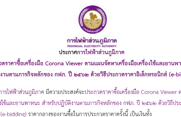 ประกาศจัดซื้อจัดจ้าง การไฟฟ้าส่วนภูมิภาค มีความประสงค์จะ ประกวดราคาซื้อเครื่องมือ Corona Viewer ตามแผนจัดหาเครื่องมือเครื่องใช้และยานพาหนะ สําหรับ ปฏิบัติงานตามภารกิจหลักของ กฟภ. ปี 2562 ด้วยวิธีประกวดราคาอิเล็กทรอนิกส์ (e-bidding)