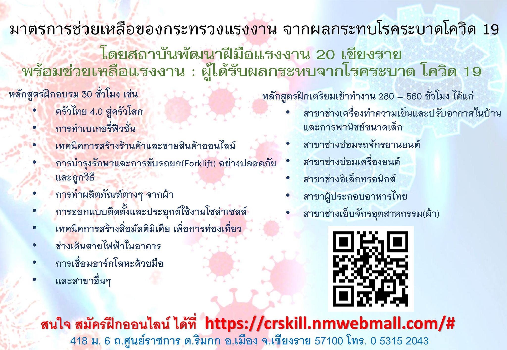 สถาบันพัฒนาฝีมือแรงงาน 20 เชียงราย เปิดรับสมัครฝึกอาชีพให้กับประชาชนทั่วไป แรงงานในสถานประกอบกิจการ ผู้ถูกเลิกจ้าง ผู้ว่างงาน ตามมาตรการช่วยเหลือแรงงานที่ได้รับจากผลกระทบโรคระบาด COVID -19 ของกระทรวงแรงงานโดยกรมพัฒนาฝีมือแรงงาน ภายใต้หลักสูตรการฝึกอบรมเพื่อพัฒนาทักษะฝีมือ Up-skill แก่แรงงานในสถานประกอบกิจการ (แรงงานในระบบ) และฝึกการประกอบอาชีพอิสระ Re-skill ให้แก่แรงงานทั่วไป และ ผู้ว่างงานหรือผู้ถูกเลิกจ้าง (แรงงานนอกระบบ) เพื่อช่วยเหลือประชาชนในการผ่านพ้นวิกฤตินี้ไปด้วยกัน