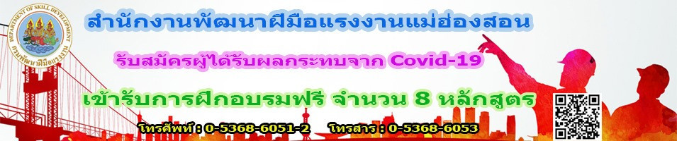 สำนักงานพัฒนาฝีมือแรงงานแม่ฮ่องสอน เปิดรับสมัครฝึกอาชีพให้กับประชาชนทั่วไป แรงงานในสถานประกอบกิจการ ผู้ถูกเลิกจ้าง ผู้ว่างงาน ตามมาตรการช่วยเหลือแรงงานที่ได้รับจากผลกระทบโรคระบาด COVID -19 ของกระทรวงแรงงานโดยกรมพัฒนาฝีมือแรงงาน ภายใต้หลักสูตรการฝึกอบรมเพื่อพัฒนาทักษะฝีมือแก่แรงงานในระบบ Up-skill และฝึกการประกอบอาชีพอิสระให้แก่แรงงานนอกระบบ Re-skill ให้กับแรงงานและบุคคลที่เข้าร่วม เพื่อช่วยเหลือประชาชนในการผ่านพ้นวิกฤตินี้ไปด้วยกัน