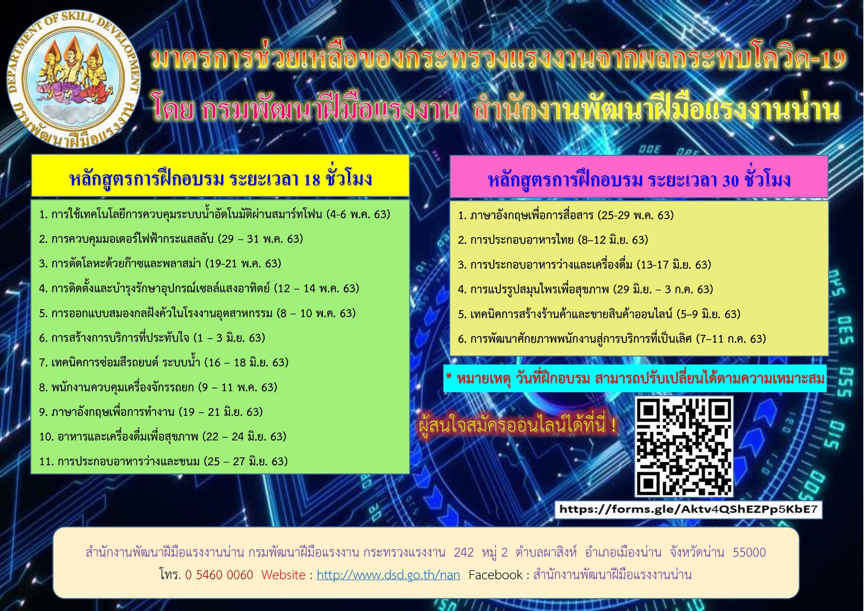 สำนักงานพัฒนาฝีมือแรงงานน่าน เปิดรับสมัครฝึกอาชีพให้กับประชาชนทั่วไป แรงงานในสถานประกอบกิจการ ผู้ถูกเลิกจ้าง ผู้ว่างงาน ตามมาตรการช่วยเหลือแรงงานที่ได้รับจากผลกระทบโรคระบาด COVID -19 ของกระทรวงแรงงานโดยกรมพัฒนาฝีมือแรงงาน ภายใต้หลักสูตรการฝึกอบรมเพื่อพัฒนาทักษะฝีมือแก่แรงงานในระบบ Up-skill และฝึกการประกอบอาชีพอิสระให้แก่แรงงานนอกระบบ Re-skill ให้กับแรงงานและบุคคลที่เข้าร่วม เพื่อช่วยเหลือประชาชนในการผ่านพ้นวิกฤตินี้ไปด้วยกัน