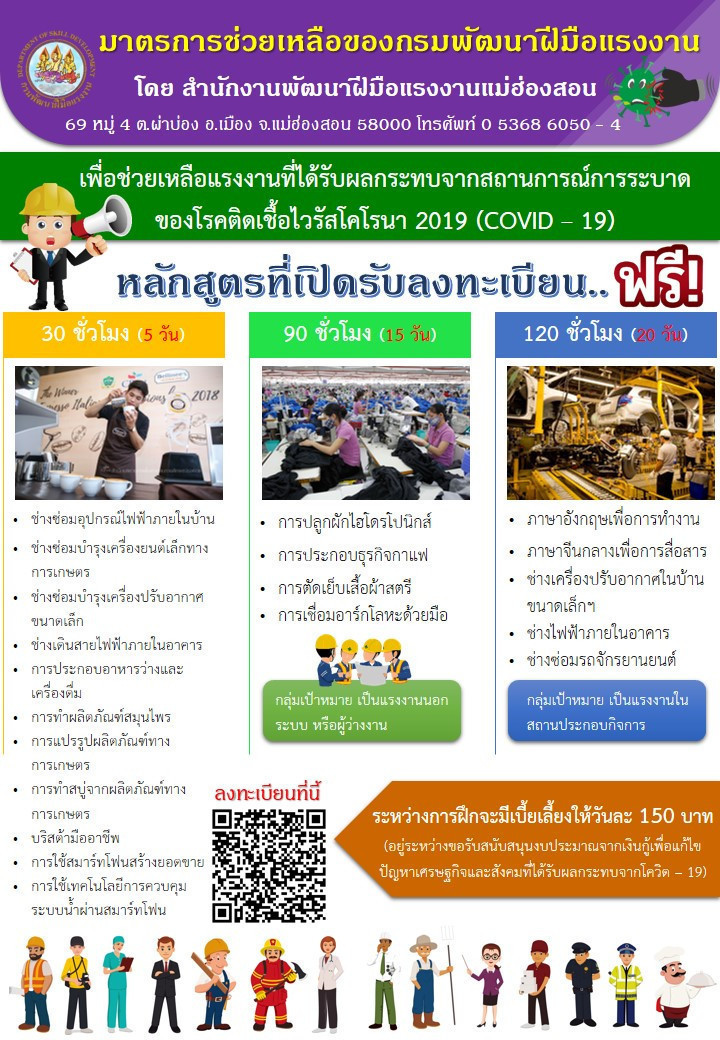อัพเดทข้อมูลวันที่ 01/05/2563 - สำนักงานพัฒนาฝีมือแรงงานแม่ฮ่องสอน เปิดรับสมัครฝึกอาชีพให้กับประชาชนทั่วไป แรงงานในสถานประกอบกิจการ ผู้ถูกเลิกจ้าง ผู้ว่างงาน อีกครั้ง ตามมาตรการช่วยเหลือแรงงานที่ได้รับจากผลกระทบโรคระบาด COVID -19 ของกระทรวงแรงงานโดยกรมพัฒนาฝีมือแรงงาน ภายใต้หลักสูตรการฝึกอบรมเพื่อพัฒนาทักษะฝีมือแก่แรงงานในระบบ Up-skill และฝึกการประกอบอาชีพอิสระให้แก่แรงงานนอกระบบ Re-skill ให้กับแรงงานและบุคคลที่เข้าร่วม ในครั้งนี้ได้เปิดหลักสูตรในอีกรูปแบบ โดยแบ่งตามกลุ่มชั่วโมงการฝึกอบรม ซึ่งจะมีสาขาการฝึกอบรมที่แตกต่างกันในแต่ละกลุ่ม ทั้งนี้มาตรการนี้จะเป็นการช่วยเหลือประชาชนและแรงงานในการผ่านพ้นวิกฤตินี้ไปด้วยกัน