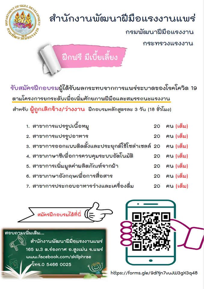 01/05/2563-สำนักงานพัฒนาฝีมือแรงงานแพร่ เปิดรับสมัครฝึกอาชีพฟรีให้กับผู้ถูกเลิกจ้าง/ผู้ว่างงาน ที่ได้รับจากผลกระทบโรคระบาด COVID -19 ตามโครงการยกระดับเพื่อเพิ่มศักยภาพฝีมือและสมรรถนะแรงงาน ภายใต้มาตรการช่วยเหลือของกระทรวงแรงาน โดยกรมพัฒนาฝีมือแรงงาน เพื่อช่วยเหลือประชาชนในการผ่านพ้นวิกฤตินี้ไปด้วยกัน