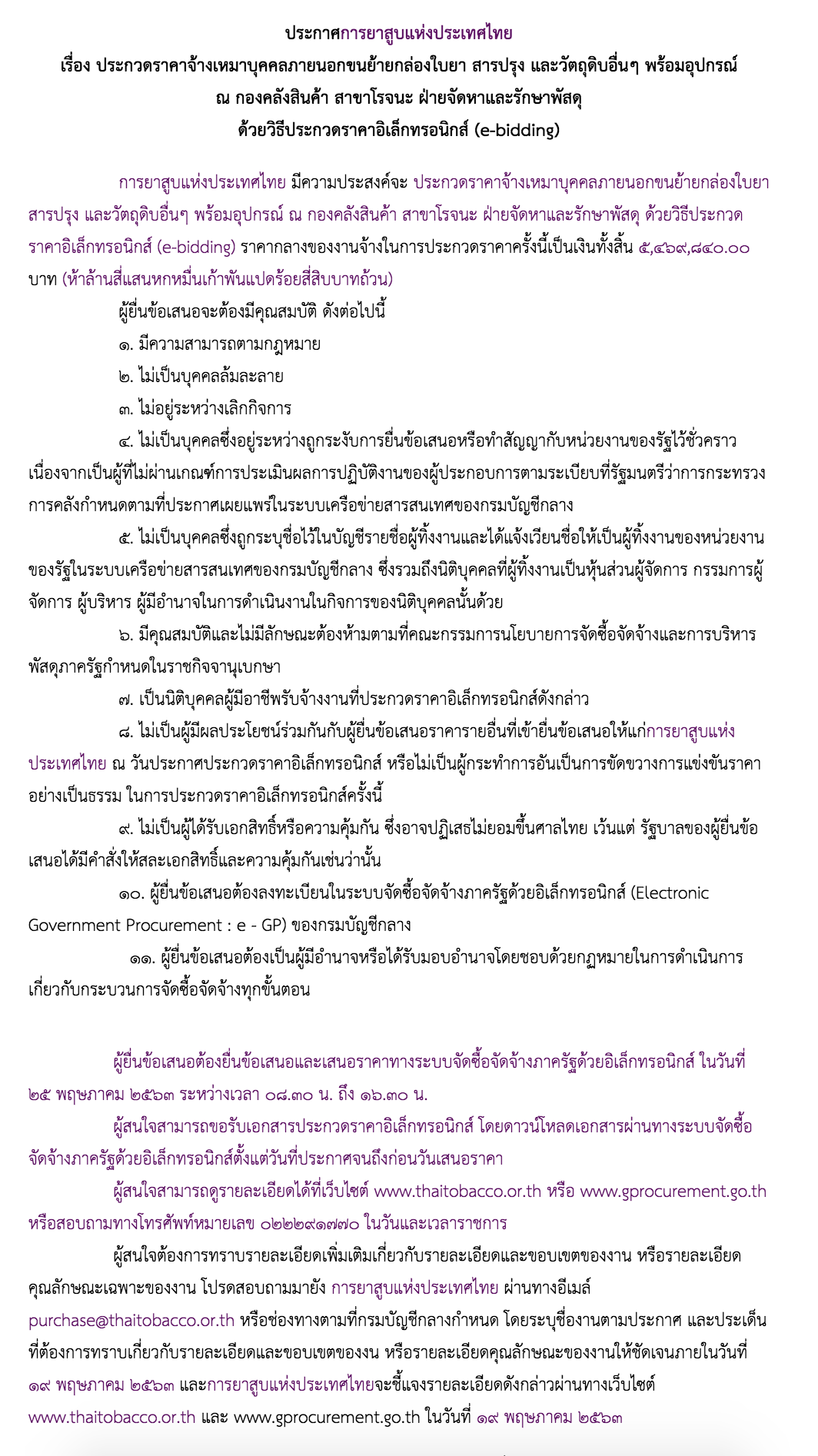 ประกาศการยาสูบแห่งประเทศไทย เรื่อง ประกวดราคาจ้างเหมาบุคคลภายนอกขนย้ายกล่องใบยา สารปรุง และวัตถุดิบอื่นๆ พร้อมอุปกรณ์ ณ กองคลังสินค้า สาขาโรจนะ ฝ่ายจัดหาและรักษาพัสดุ ด้วยวิธีประกวดราคาอิเล็กทรอนิกส์ (e-bidding)