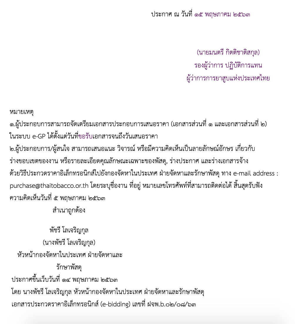 ผู้สนใจสามารถดูรายละเอียดได้ที่เว็บไซต์ www.thaitobacco.or.th หรือ www.gprocurement.go.th หรือสอบถามทางโทรศัพท์หมายเลข ๐๒๒๒๙๑๗๗๐ ในวันและเวลาราชการ