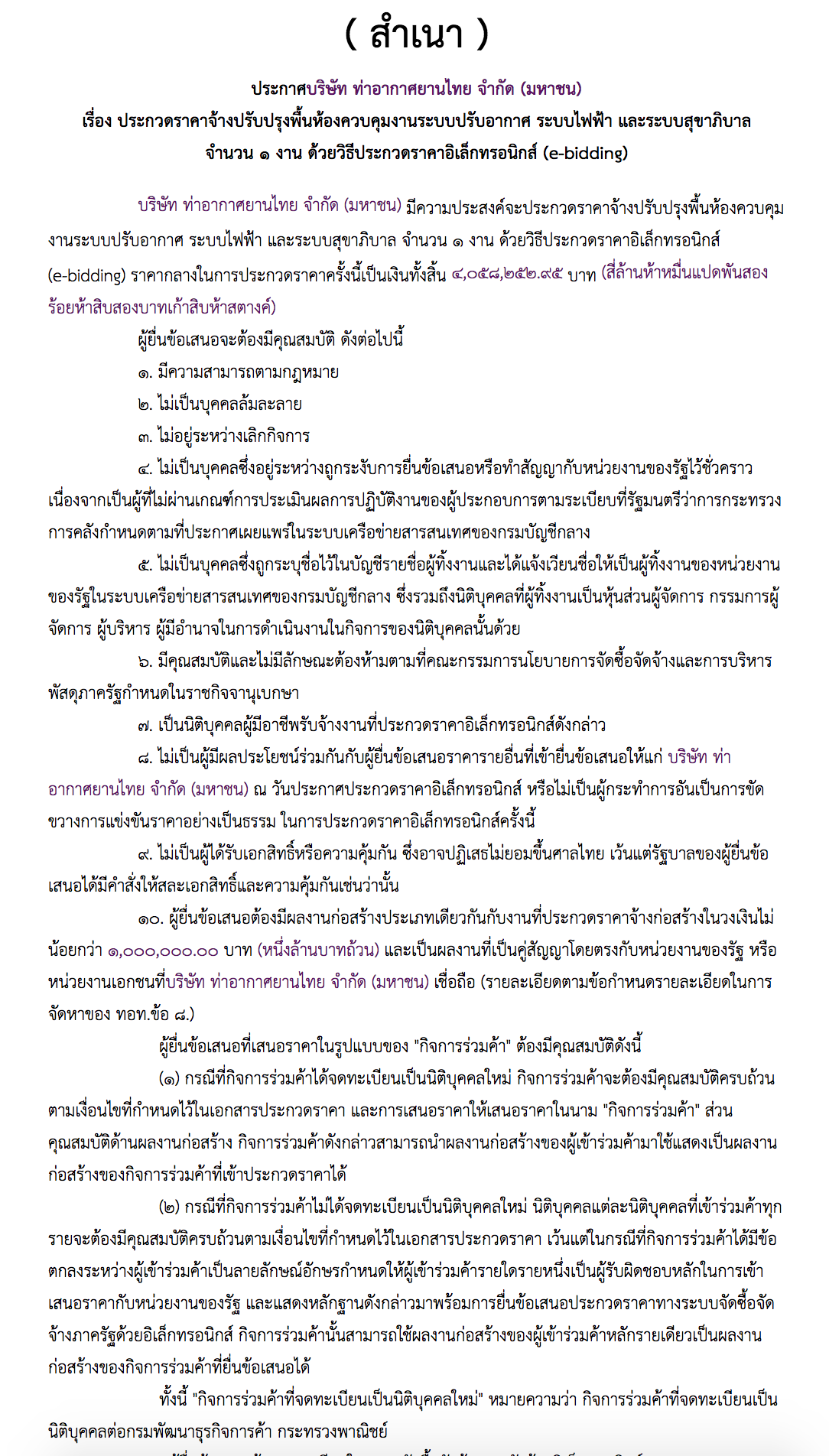 ประกาศบริษัท ท่าอากาศยานไทย จำกัด (มหาชน) เรื่อง ประกวดราคาจ้างปรับปรุงพื้นห้องควบคุมงานระบบปรับอากาศ ระบบไฟฟ้า และระบบสุขาภิบาล จำนวน ๑ งาน ด้วยวิธีประกวดราคาอิเล็กทรอนิกส์ (e-bidding)