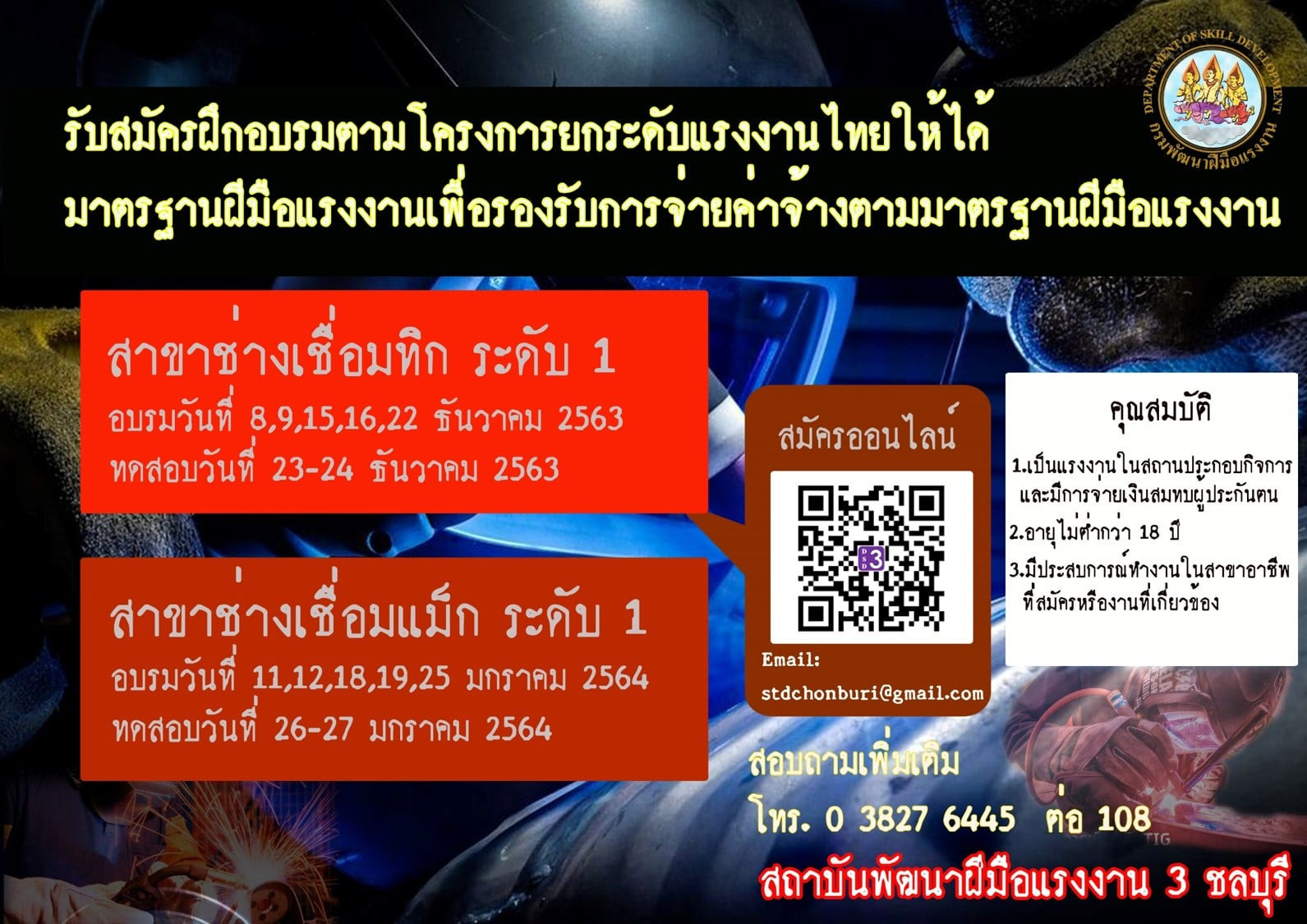 สถาบันพัฒนาฝีมือแรงงาน 3 ชลบุรี ได้ประกาศรับสมัครแรงงานในสถานประกอบกิจการ โดยเฉพาะช่างเชื่อม เข้ารับการฝึกอบรมหลักสูตรยกระดับฝีมือแรงงานและทดสอบมาตรฐานฝีมือแรงงานแห่งชาติ ตามโครงการยกระดับแรงงานไทยให้ได้มาตรฐานฝีมือแรงงานเพื่อรองรับการจ่ายค่าจ้างตามมาตรฐานฝีมือแรงงาน ประจำปีงบประมาณ พ.ศ.2564 (ตุลาคม 2563 – มีนาคม 2564) โดยได้เปิดฝึกอบรมหลักสูตรฯ จำนวน 2 รุ่น