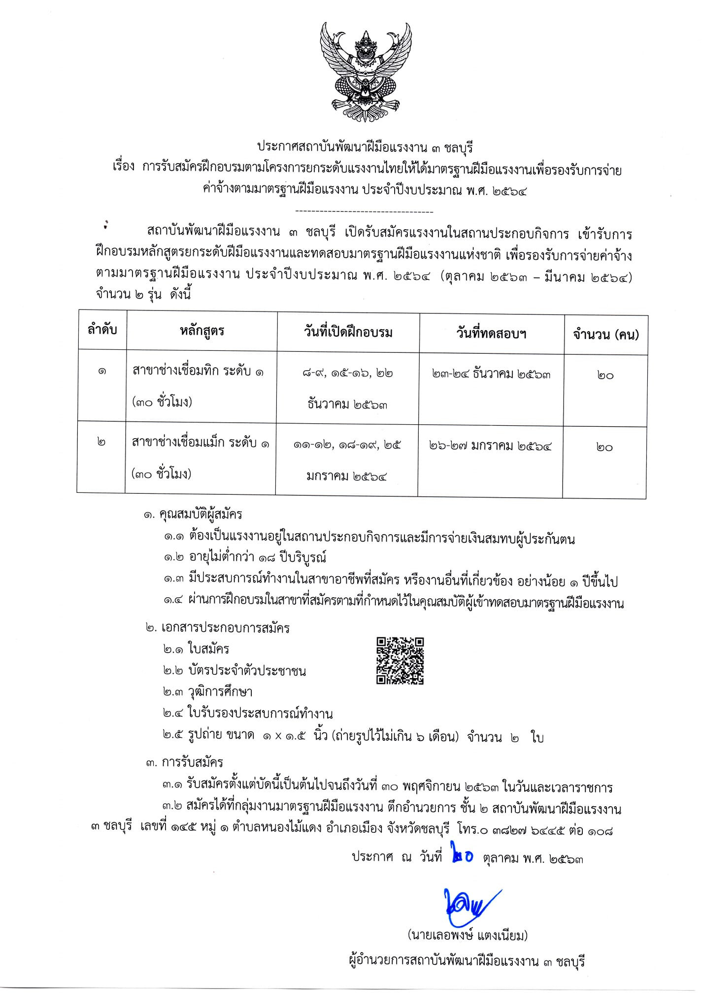 ฝึกอบรมพร้อมทดสอบมาตรฐานฝีมือแรงงานแห่งชาติ รับสมัครจำนวนจำกัด โดยได้มีการกำหนดคุณสมบัติของผู้สมัครและรายละเอียดของหลักสูตร ดังนี้