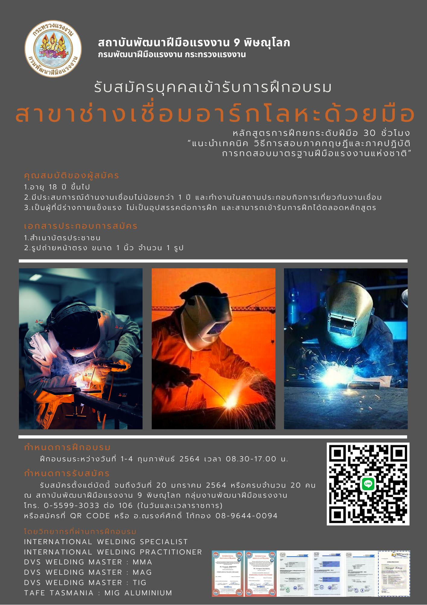 สถาบันพัฒนาฝีมือแรงงาน 9 พิษณุโลก รับสมัครช่างเชื่อมในสถานประกอบกิจการ สมัครเข้าร่วมฝึกอบรม ในหลักสูตรการฝึกยกระดับฝีมือ 30 ชั่วโมง สาขา ช่างเชื่อมอาร์กโลหะด้วยมือ ทั้งนี้เพื่อช่วยให้แรงงานสามารถเกิดการพัฒนาต่อยอดในอาชีพ เพิ่มพูนทักษะในการทำงานและฝึกฝนเพิ่มประสบการณ์มากยิ่งขึ้น อีกทั้งเพื่อเตรียมความพร้อมในการทดสอบมาตรฐานฝีมือแรงงานแห่งชาติและการประเมินความรู้ความสามารถ (ไลเซนส์) สำหรับในบางสาขา เมื่อเสร็จสิ้นการฝึกแล้วจะได้รับวุฒิบัตรทุกสาขาอาชีพจากหลักสูตร