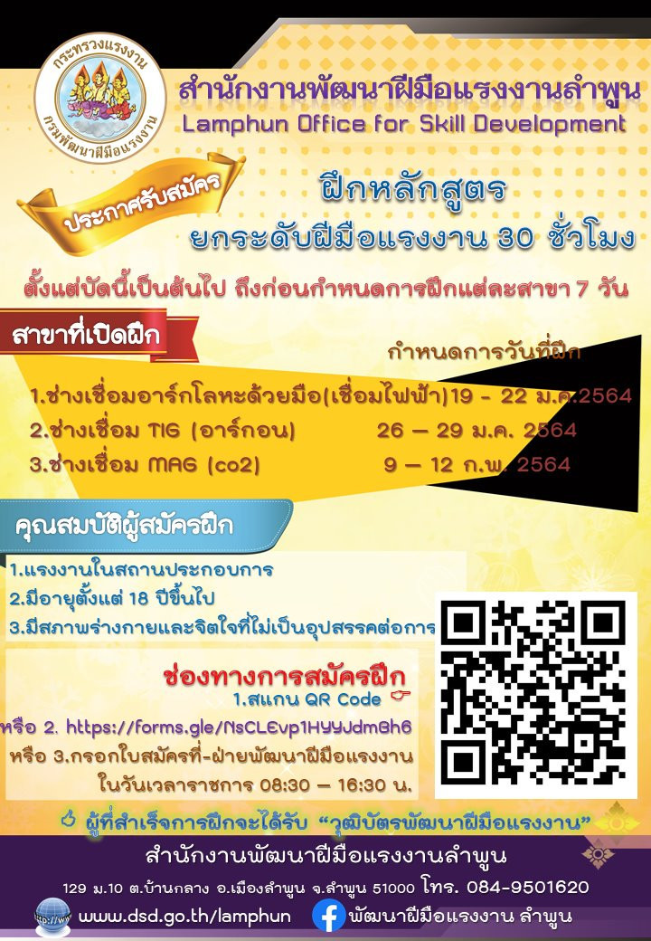 สำนักงานพัฒนาฝีมือแรงงานลำพูน ประกาศขอเชิญชวนช่างเชื่อมในสถานประกอบกิจการที่สนใจ สมัครเข้าร่วมฝึกอบรมในหลักสูตรยกระดับฝีมือแรงงาน อาชีพช่างเชื่อม ระยะเวลาฝึกอบรมจำนวน 30 ชั่วโมง จำนวน 3 สาขา ทั้งนี้เพื่อช่วยให้ผู้ที่เข้าร่วมการฝึกสามารถเกิดการพัฒนาต่อยอดในอาชีพ เพิ่มพูนทักษะในการทำงานและฝึกฝนเพิ่มประสบการณ์มากยิ่งขึ้น อีกทั้งเพื่อเตรียมความพร้อมในการทดสอบมาตรฐานฝีมือแรงงานแห่งชาติและการประเมินความรู้ความสามารถ (ไลเซนส์) สำหรับในบางสาขา เมื่อเสร็จสิ้นการฝึกแล้วจะได้รับวุฒิบัตรทุกสาขาอาชีพจากหลักสูตร