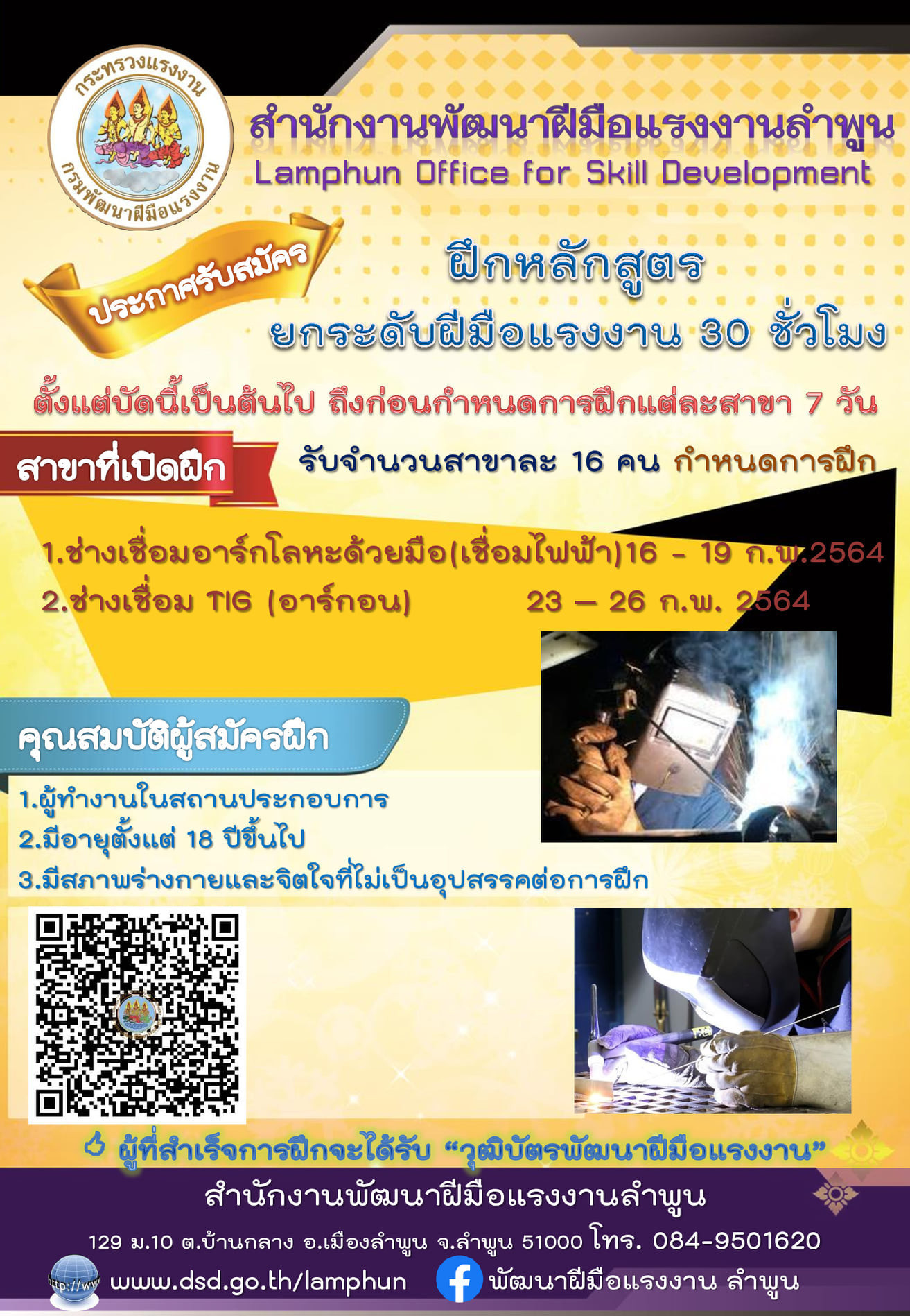 สำนักงานพัฒนาฝีมือแรงงานลำพูน ประกาศขอเชิญชวนบุคคลทั่วไป ผู้ว่างงาน ช่างเชื่อมในสถานประกอบกิจการที่สนใจ สมัครเข้าร่วมฝึกอบรมในหลักสูตรยกระดับฝีมือแรงงาน จำนวน 2 สาขาช่างเชื่อม ระยะเวลาฝึกอบรมจำนวน 30 ชั่วโมง ทั้งนี้เพื่อช่วยให้ผู้ที่เข้าร่วมการฝึกสามารถเกิดการพัฒนาต่อยอดในอาชีพ เพิ่มพูนทักษะในการทำงานและฝึกฝนเพิ่มประสบการณ์มากยิ่งขึ้น อีกทั้งเพื่อเตรียมความพร้อมในการทดสอบมาตรฐานฝีมือแรงงานแห่งชาติและการประเมินความรู้ความสามารถ (ไลเซนส์) สำหรับในบางสาขา เมื่อเสร็จสิ้นการฝึกแล้วจะได้รับวุฒิบัตรทุกสาขาอาชีพจากหลักสูตร