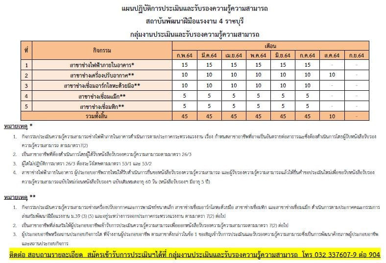 - กิจกรรมประเมินความรู้ความสามารถ สาขาช่างเครื่องปรับอากาศและการพาณิชย์ขนาดเล็ก สาขาช่างเชื่อมอาร์กโลหะด้วยมือ สาขาช่างเชื่อมทิก และสาขาช่างเชื่อมแม็ก ดำเนินการตามประกาศคณะกรรมการส่งเสริมพัฒนาฝีมือแรงงาน ม.39 (3)(5) และอยู่ระหว่างการออกประกาศกระทรวงแรงงาน ตามมาตรา 7(2) ต่อไป