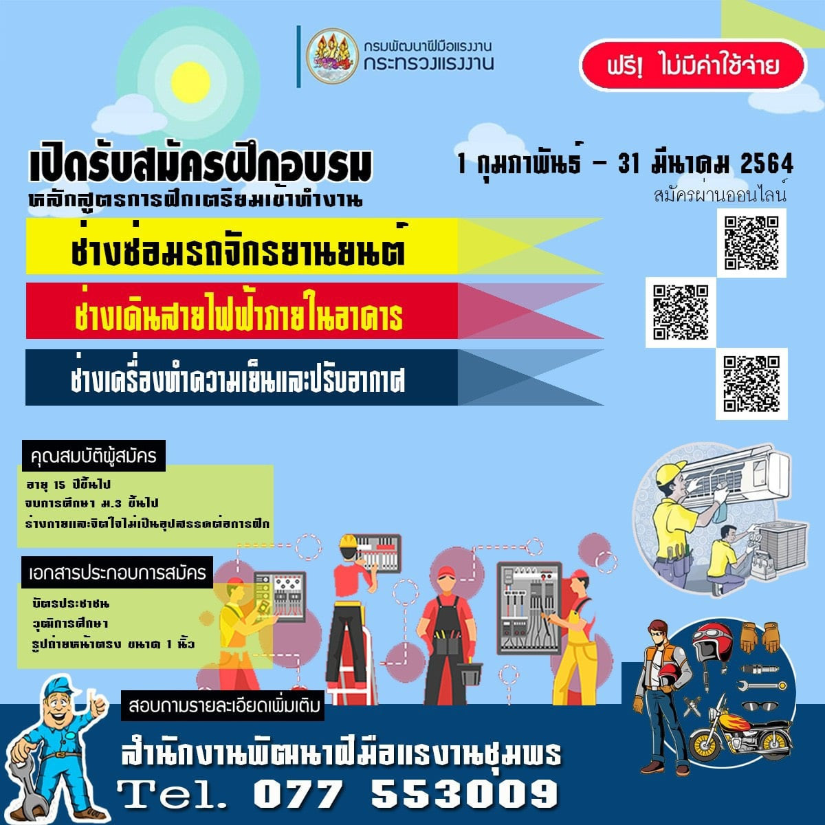 สำนักงานพัฒนาฝีมือแรงงานชุมพร ประชาสัมพันธ์รับสมัครการฝึกอบรมให้แก่ประชาชนทั่วไปที่สนใจ แรงงานใหม่ ผู้จบการศึกษา ผู้ว่างงาน ผู้ถูกเลิกจ้าง หรือ ผู้ที่ต้องการฝึกเพื่อเปลี่ยนสาขาอาชีพ เข้ารับการฝึกอบรมฟรี ในหลักสูตรเตรียมเข้าทำงาน เพื่อฝึกฝนพื้นฐานทักษะความรู้ต่างๆ ตลอดจนวิธีการทำงานให้มีความพร้อมก่อนไปประกอบอาชีพ สาขาช่างในหลักสูตรที่ได้สำเร็จการฝึกทั้งหมดจะได้รับวุฒิบัตรสามารถนำไปแนบในการสมัครงานได้