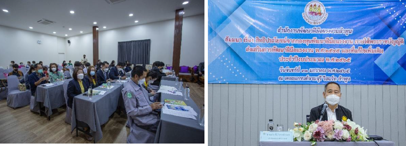 (ช่วงเช้า) กิจกรรมสัมมนา "สิทธิประโยชน์จากกองทุนพัฒนาฝีมือแรงงาน ภายใต้พระราชบัญญัติส่งเสริมการพัฒนาฝีมือแรงงาน พ.ศ. 2545 และที่แก้ไขเพิ่มเติม” ประจาปีงบประมาณ 2565 โดย สำนักงานพัฒนาฝีมือแรงงาน จังหวัดลำพูน ณ ห้องจามจุรี 2 เดอะแกรนด์ จามจุรี รีสอร์ท ลำพูน โดยมี นายประทีป ทรงลำยอง อธิบดีกรมพัฒนาฝีมือแรงงาน เป็นประธานเปิดโครงการสัมมนาและ นายพงษ์ศักดิ์ โพธินาม ผู้อำนวยการสำผนักงานพัฒนาฝีมือแรงงานลำพูน เป็นผู้กล่าวรายงาน ผู้เข้าร่วมกิจกรรมสัมมนาในครั้งนี้ได้แก่ ผู้ฝึกอบรมพัฒนาฝีมือและ สถานประกอบกิจการ ภายในจังหวัดลำพูน วัตถุประสงค์ในการจัดโครงการฝึกอบรมในครั้งนี้เพื่อสร้างความรู้ความเข้าใจ และการเผยแพร่ข้อมูลประชาสัมพันธ์แก่ผู้ประกอบกิจการ ผู้ดำเนินการทดสอบมาตรฐานฝีมือแรงงาน ตามมาตรา 24 และศูนย์ประเมินความรู้ความสามารถตามมาตรา 26/4(2) ที่ดำเนินการส่งเสริมการพัฒนาฝีมือแรงงาน รวมถึงเป็นการสื่อสารให้กลุ่มดังกล่าวทราบถึงสิทธิประโยชน์ที่จะได้รับจากกองทุนพัฒนาฝีมือแรงงาน ในเรื่องการให้กู้ยืม การให้เงินช่วยเหลือหรืออุดหนุน ทำให้เกิดเครือข่ายความร่วมมือและสร้างแรงจูงใจในการเข้าถึงการให้บริการของกองทุนพัฒนาฝีมือแรงงานเพิ่มขึ้นและผู้เข้าร่วมสัมมนาสามารถนาความรู้ความเข้าใจที่ได้ไปใช้ให้เกิดประโยชน์ในการทางานต่อไป