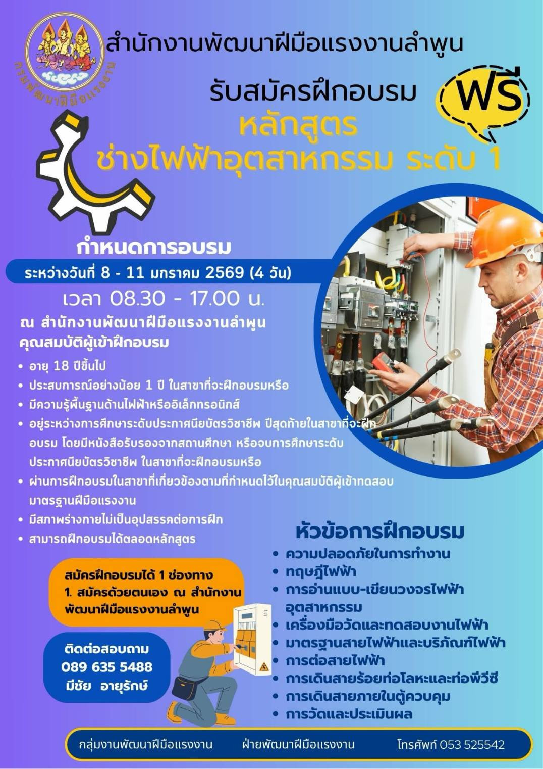 ฟรี สำนักงานพัฒนาฝีมือแรงงานลำพูน รับสมัครฝึกอบรมหลักสูตรช่างไฟฟ้าอุตสาหกรรรม ระดับ 1