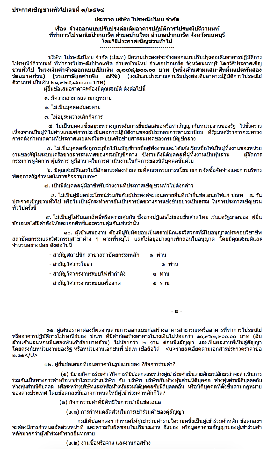 ประกาศ บริษัท ไปรษณีย์ไทย จำกัด เรื่อง จ้างออกแบบปรับปรุงต่อเติมอาคารปฏิบัติการไปรษณีย์ติวานนท์ ที่ทำการไปรษณีย์ปากเกร็ด ตำบลบ้านใหม่ อำเภอปากเกร็ด จังหวัดนนทบุรีโดยวิธีประกาศเชิญชวนทั่วไป