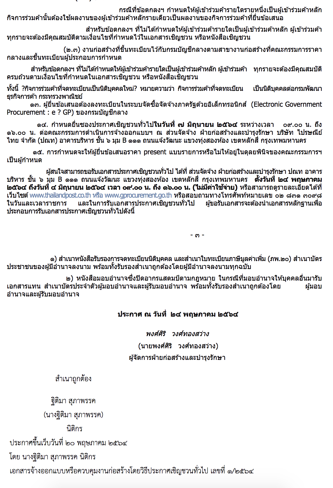 กำหนดขายเอกสารประกวดราคา -ผู้สนใจสามารถขอรับเอกสารประกาศเชิญชวนทั่วไป ได้ที่ ส่วนจัดจ้าง ฝ่ายก่อสร้างและบำรุงรักษา ปณท อาคารบริหาร ชั้น ๖ มุม B ๑๑๑ ถนนแจ้งวัฒนะ แขวงทุ่งสองห้อง เขตหลักสี่ กรุงเทพมหานคร ตั้งวันที่ ๒๔ พฤษภาคม ๒๕๖๔ ถึงวันที่ ๔ มิถุนายน ๒๕๖๔ เวลา ๐๙.๐๐ น. ถึง ๑๖.๐๐ น. (ไม่มีค่าใช้จ่าย) หรือสามารถดูรายละเอียดได้ที่เว็บไซต์ www.thailandpost.co.th หรือ www.gprocurement.go.th