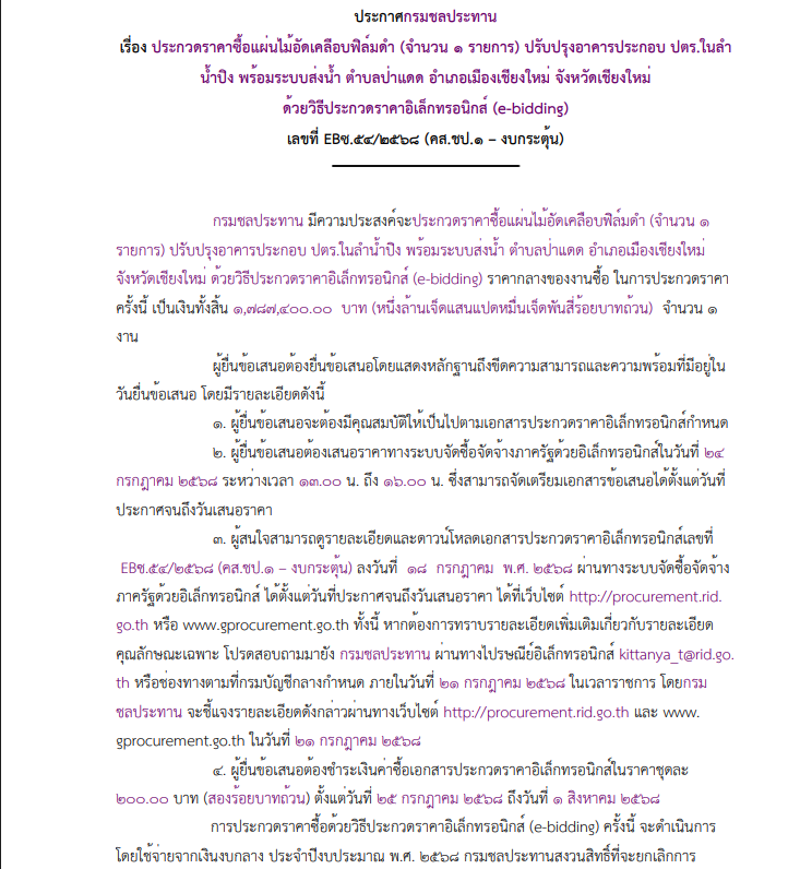 เรื่อง ประกวดราคาซื้อแผ่นไม้อัดเคลือบฟิล์มดำ (จำนวน ๑ รายการ) ปรับปรุงอาคารประกอบ ปตร.ในลำ น้ำปิง พร้อมระบบส่งน้ำ ตำบลป่าแดด อำเภอเมืองเชียงใหม่ จังหวัดเชียงใหม่ ด้วยวิธีประกวดราคาอิเล็กทรอนิกส์ (e-bidding)