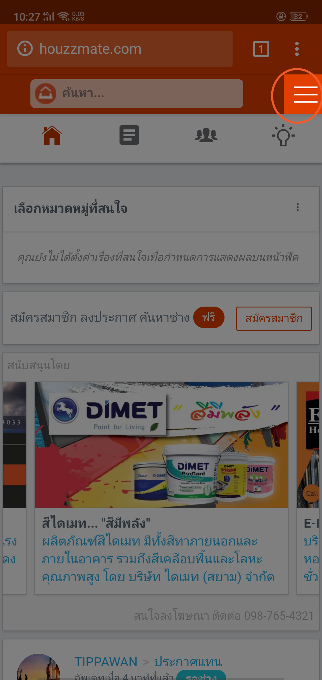 5.) ท่านจะเข้ามาสู่หนัาหลักของ HouzzMate.com พร้อมกับสถานะการเป็นสมาชิกของท่านเว็บไซต์ โดยสามารถเช็คสถานะได้โดยการแตะที่ปุ่มสัญลักษณ์เมนูเหมือนขั้นตอนที่ 2 หน้าต่างเมนูหลักจะปรากฎขึ้นมาพร้อมชื่อบัญชีสมาชิกของท่าน
